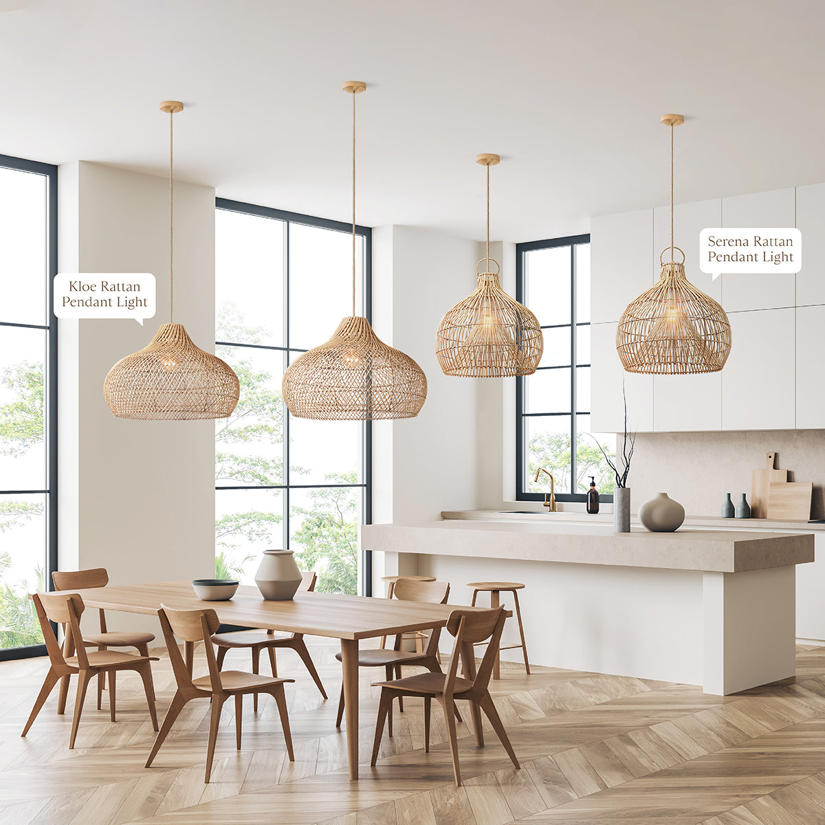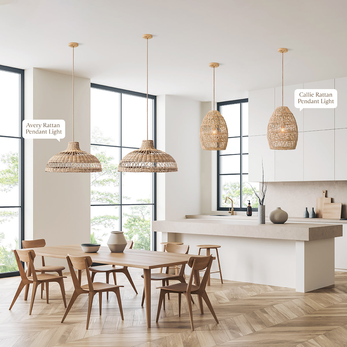 Also, the Callie Rattan Pendant Light is available in a variety of natural rattan tones. Whether you prefer a light, blonde finish that emanates a fresh and breezy vibe or a darker, richer tone that adds sophistication and depth, you can select the perfect shade that complements your kitchen decor.