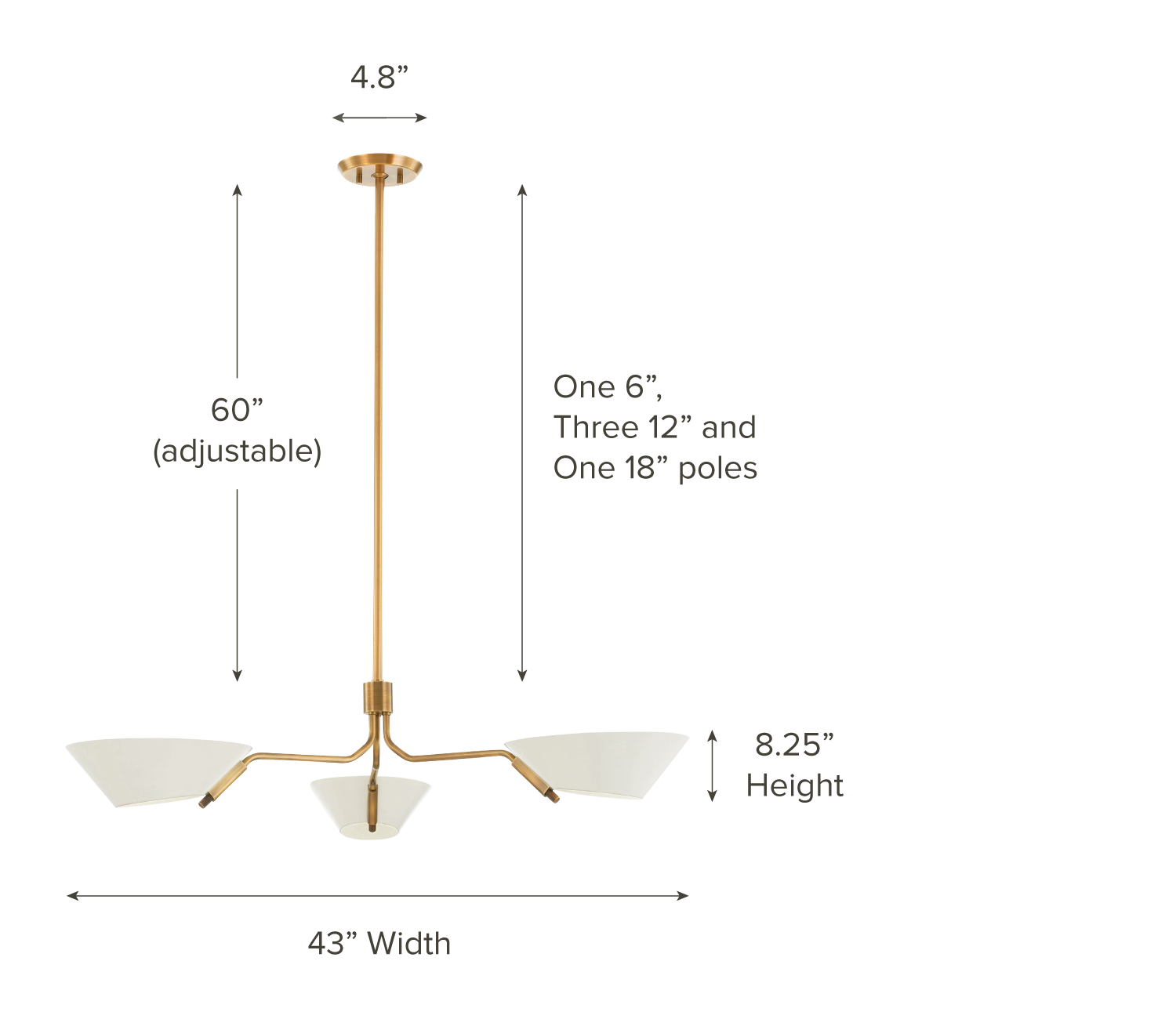 This pendant light is crafted from durable metal and features an elegant aged brass-like finish paired with crisp white shades. Its unique three-arm arrangement and sleek, low-profile design create a striking geometric silhouette – a nod to mid-century modern style with a contemporary twist.
