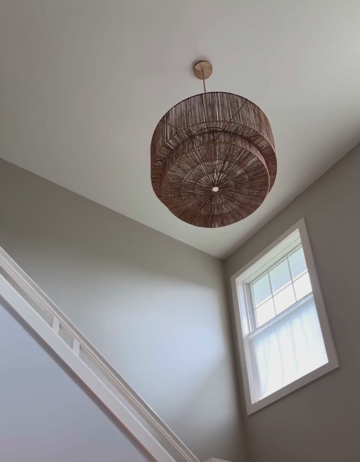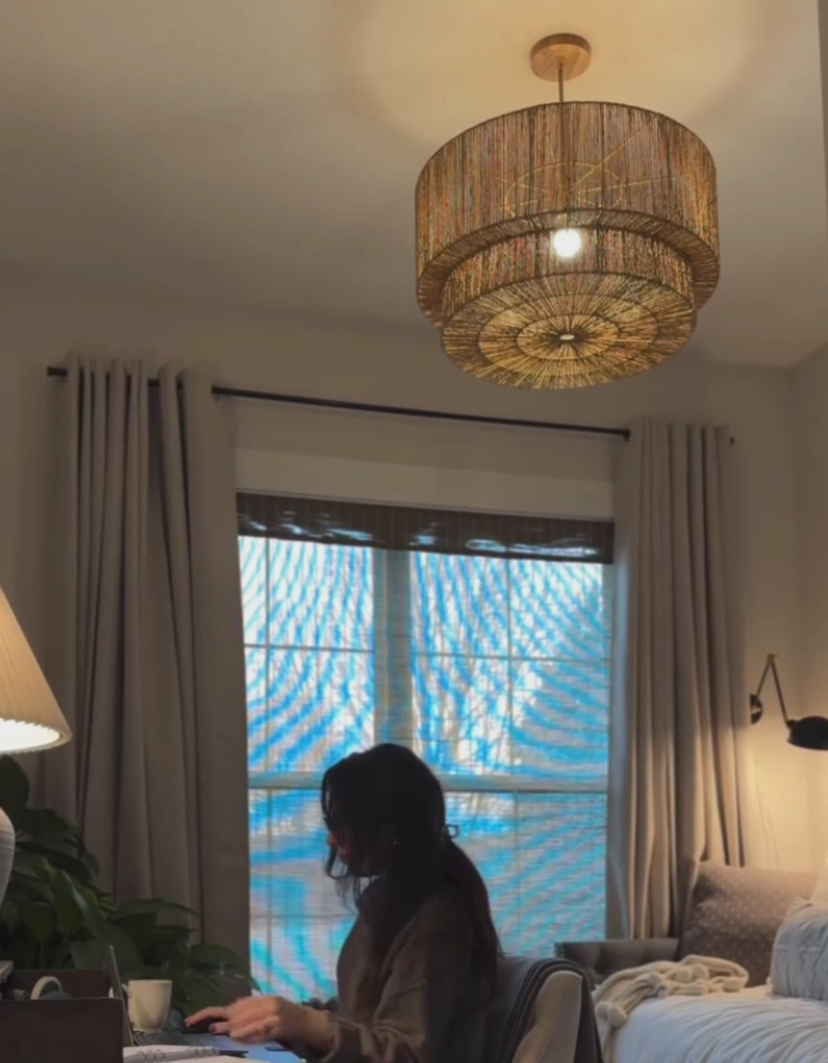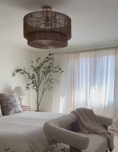 Experience the captivating detail of our 'Luminous Lace' rattan pendant light. Its intricate, lace-like design casts stunning shadows and warm, inviting light.