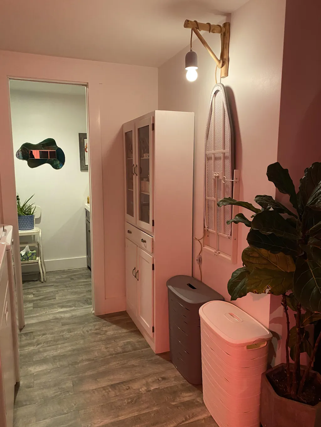kols nana pendant light for narrow hallway with a wooden cabinet and framed picture