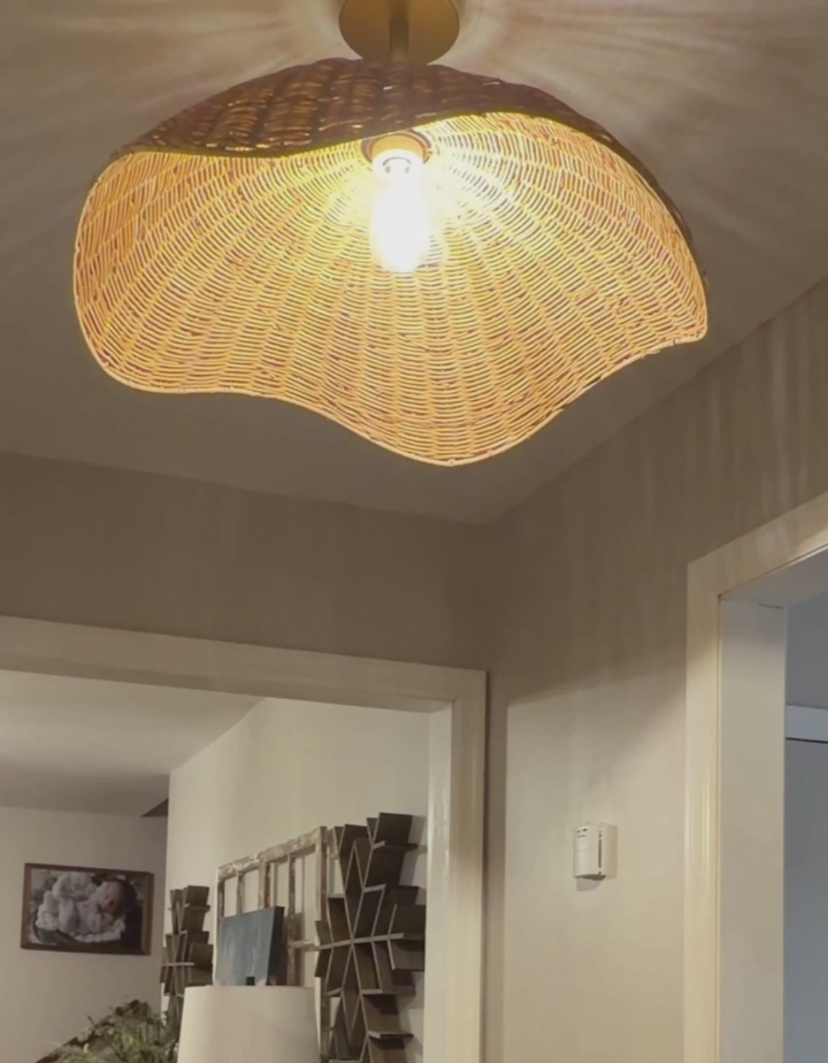 nana vermiculae woven rattan light hanging against on