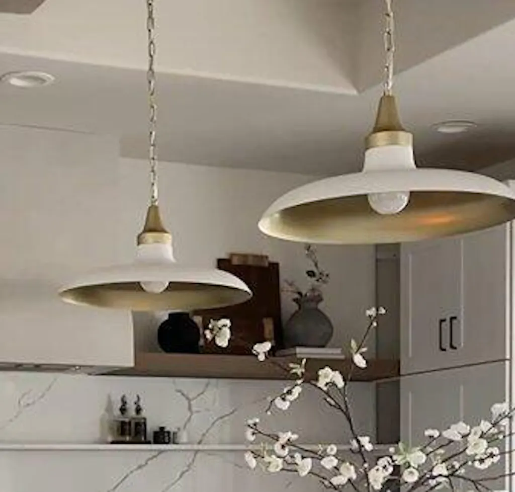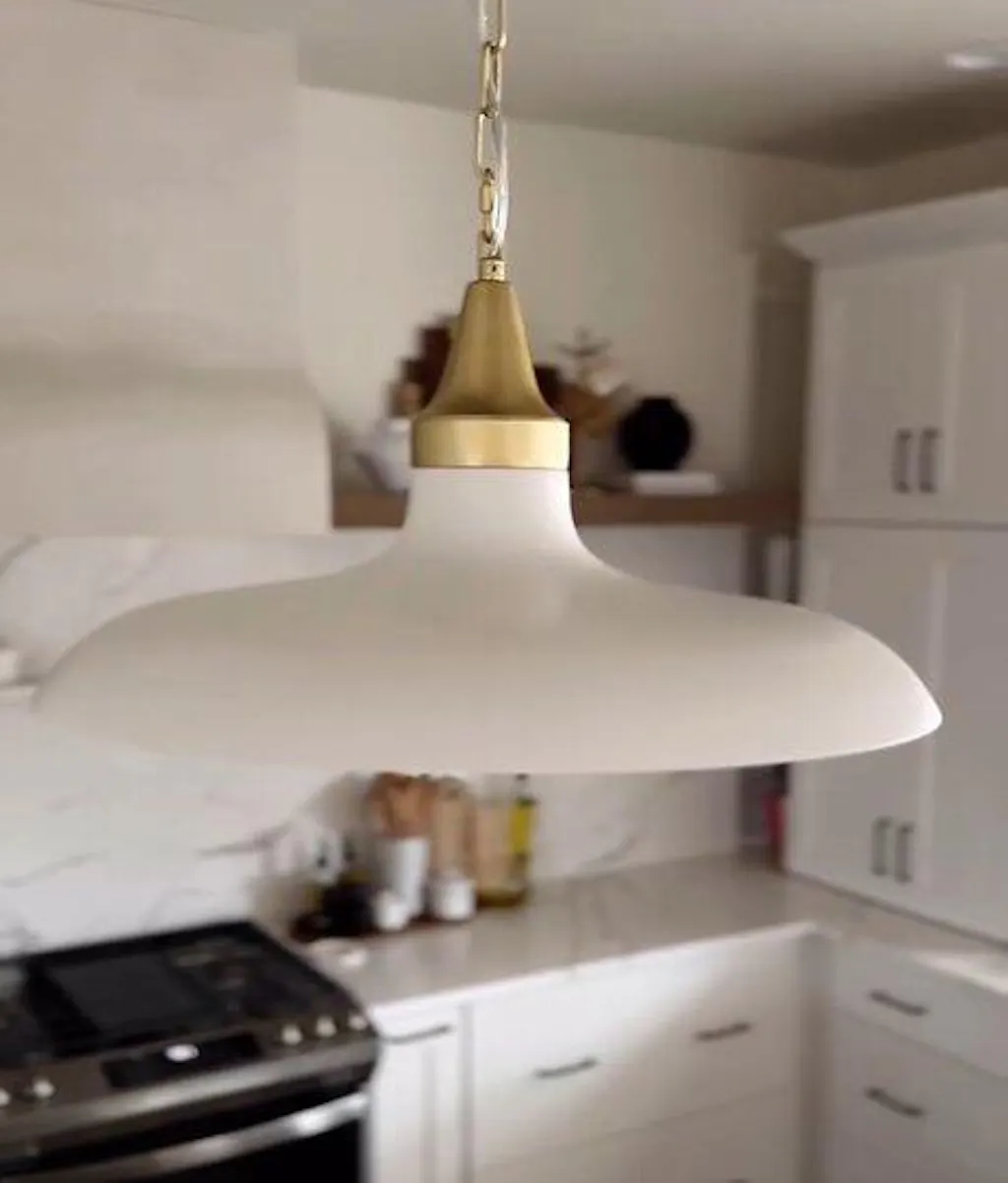 Bring contemporary sophistication to your home with the Natalia Dome Pendant Light — a sleek, stylish pendant light that embodies minimalist elegance. Its clean, streamlined design and sophisticated combination of matte white and warm brass-finish tones effortlessly capture attention, providing both visual charm and practical illumination.