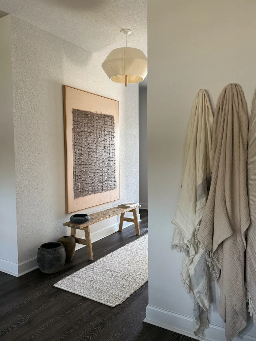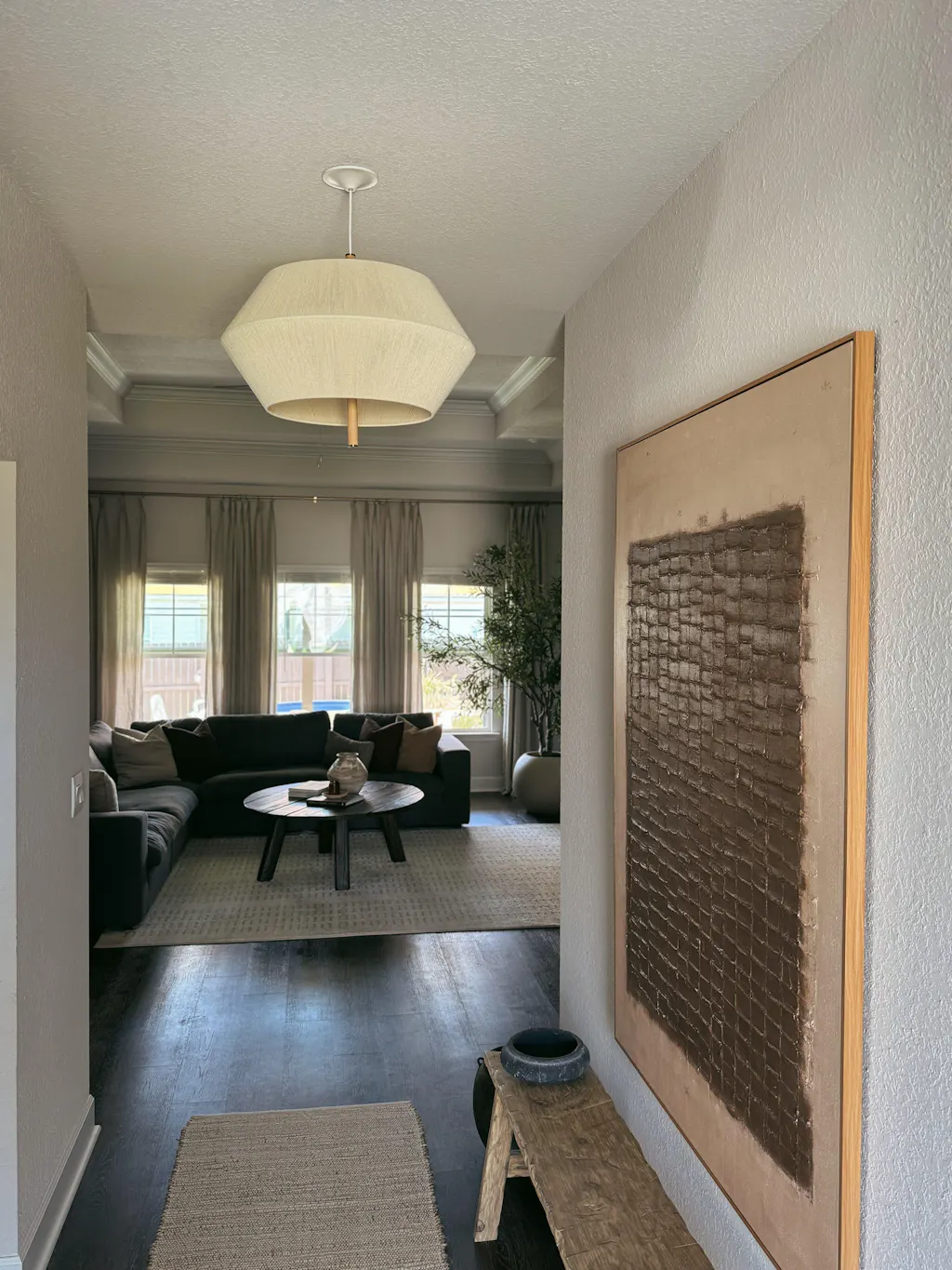Crafted with care, this contemporary lighting fixture features a high-quality jute shade complemented by subtle wood and metal detailing.