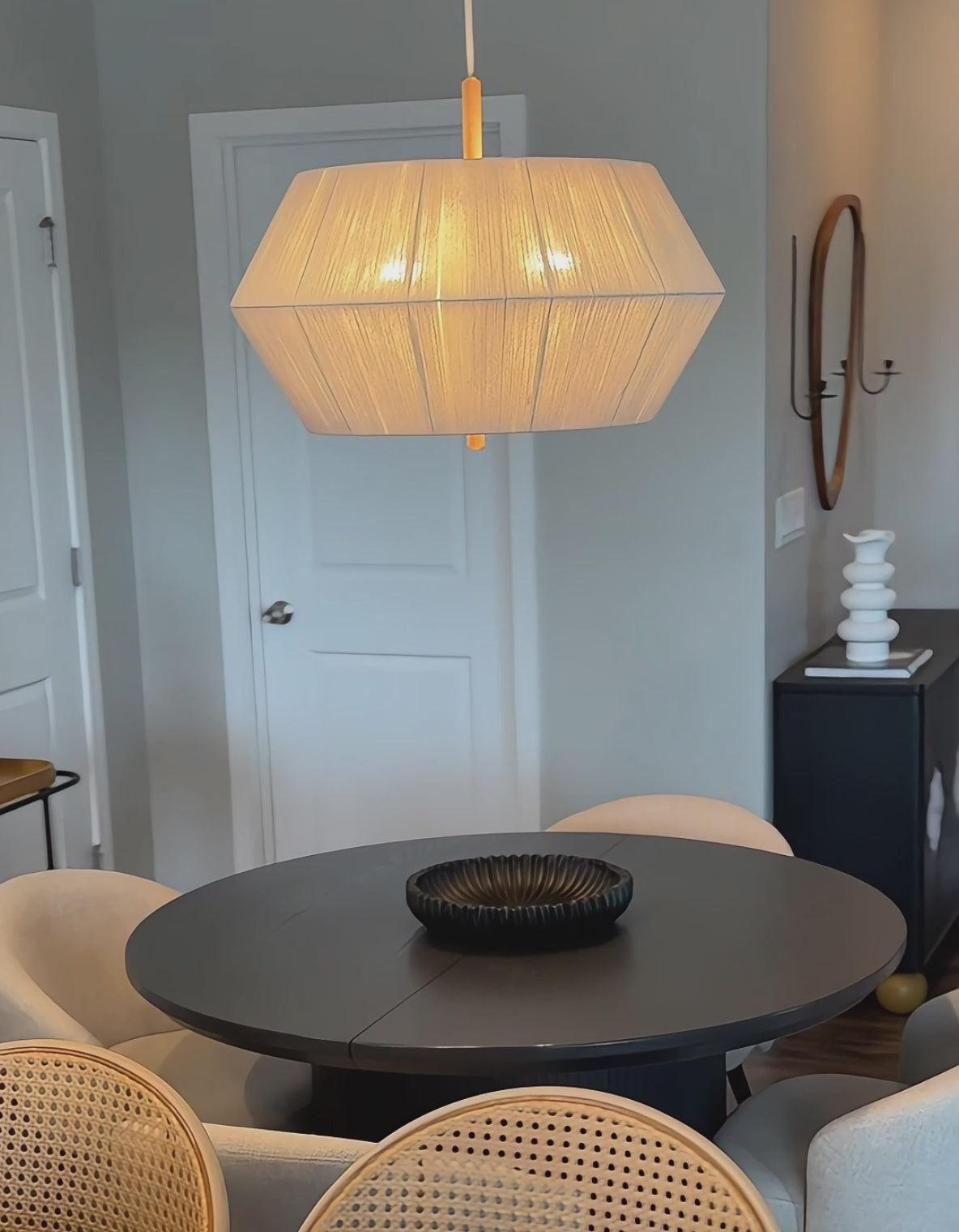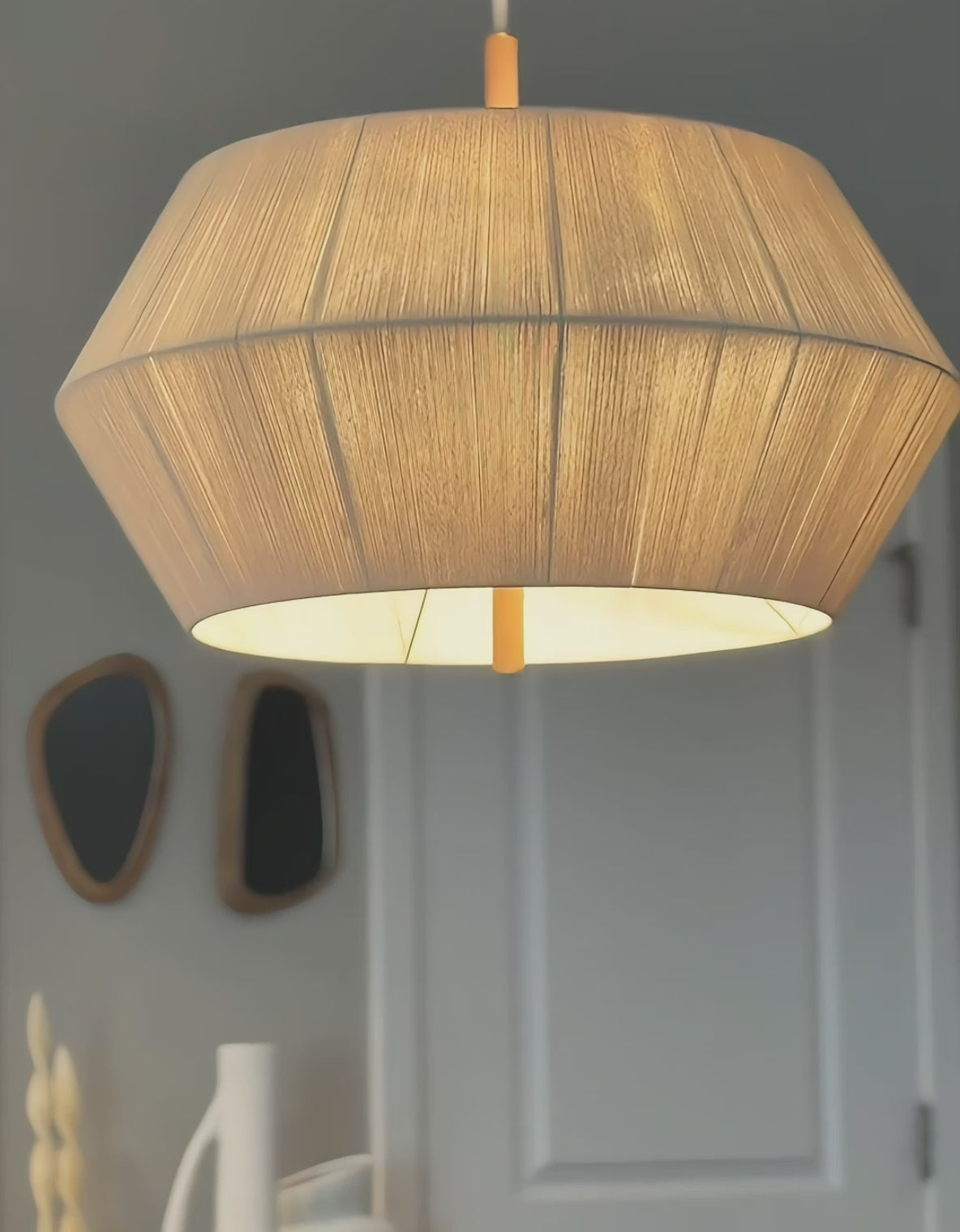 The Nimbus Pendant Light by Rowabi showcases contemporary sophistication with a touch of organic modern charm. This modern pendant light is distinguished by its distinctive geometric shape and elegant jute shade, providing a soft, inviting illumination. Its minimalist design and warm textures perfectly embody modern simplicity.