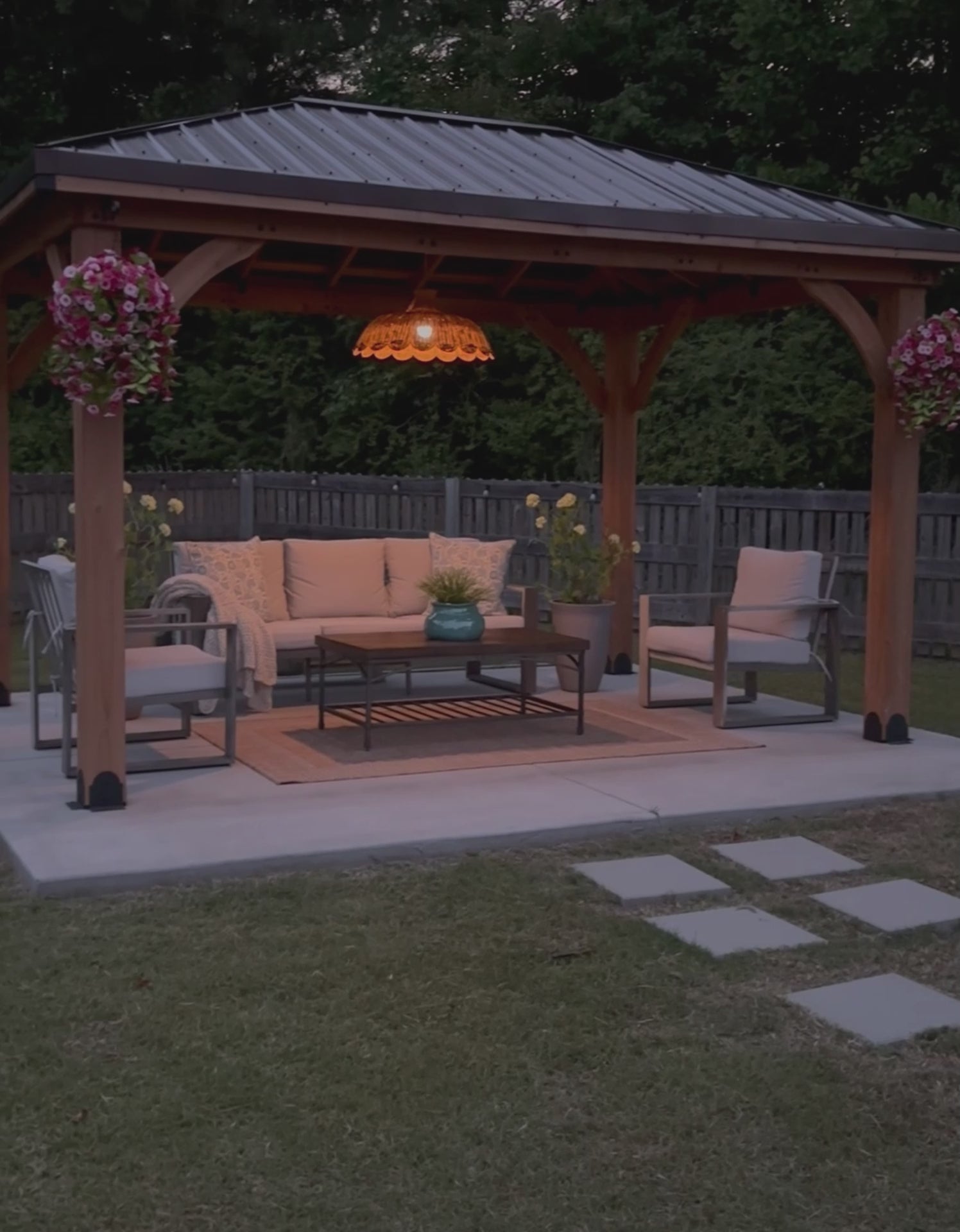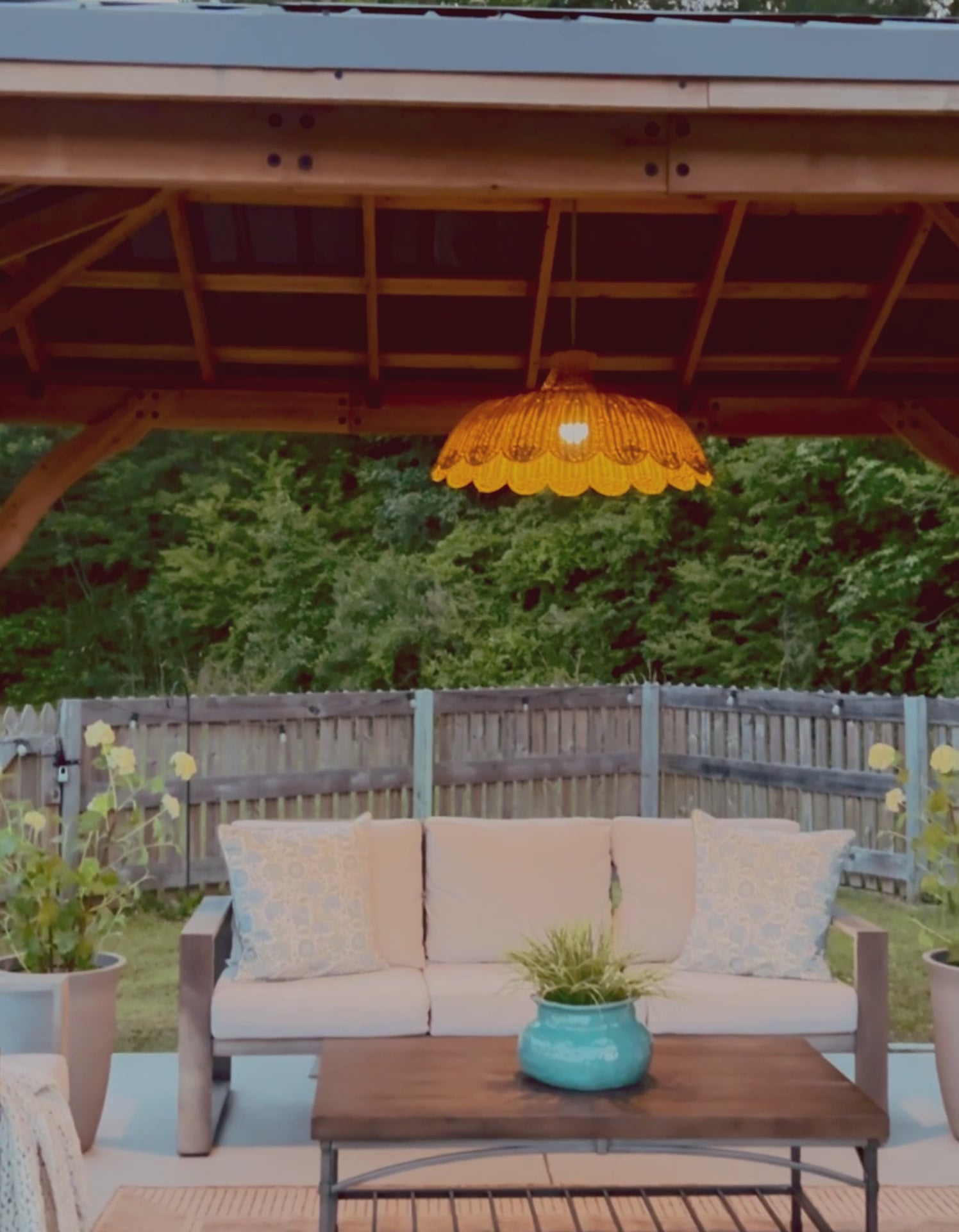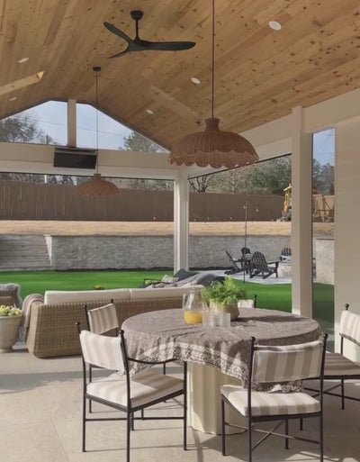 The handwoven pendant offers a warm and inviting ambiance, while its sleek lines and contemporary styling make it an ideal addition to modern patios, porches, or outdoor seating areas.